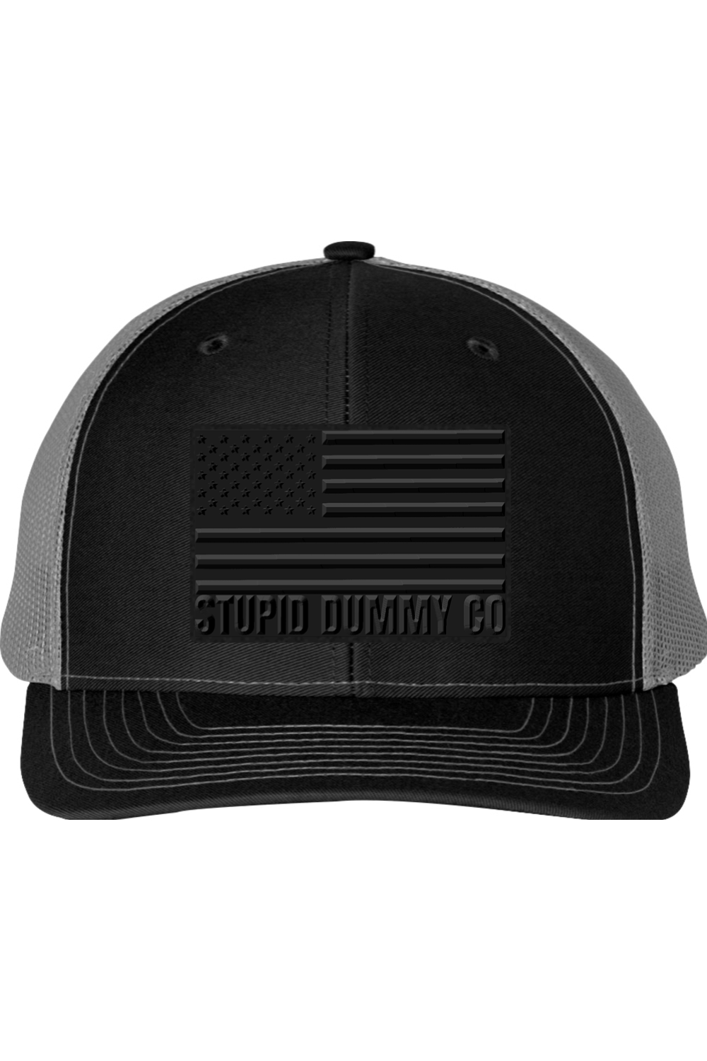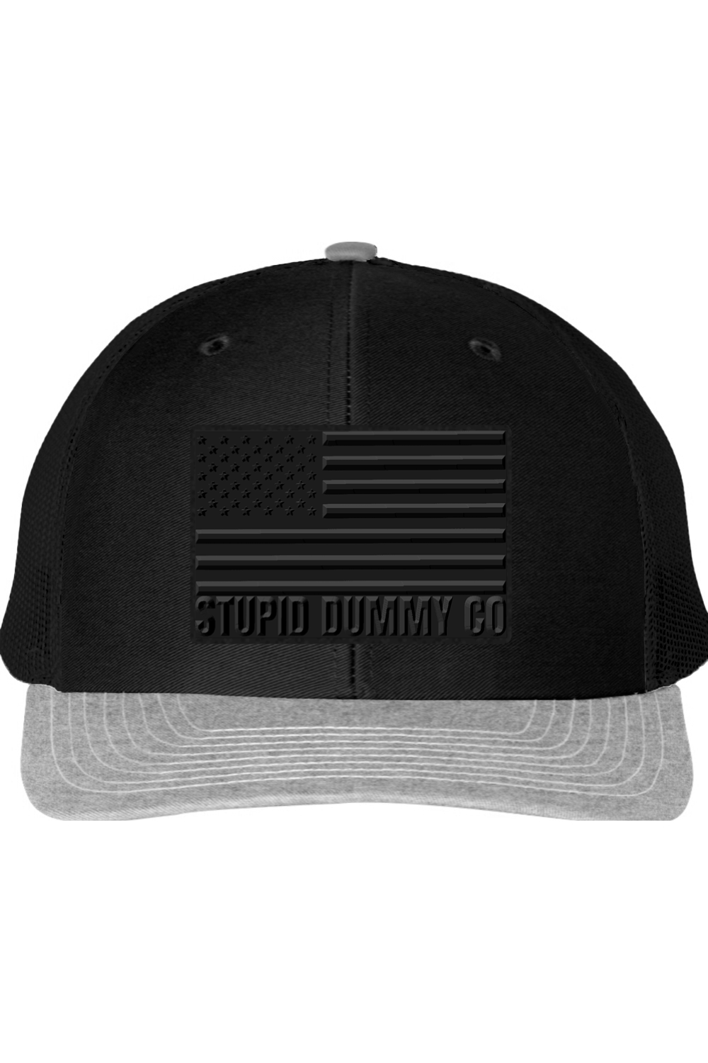 Clean heather grey front. Black mesh back. Matte black American flag patch front and center with STUPID DUMMY CO™ embossed like it means business. Because it does.